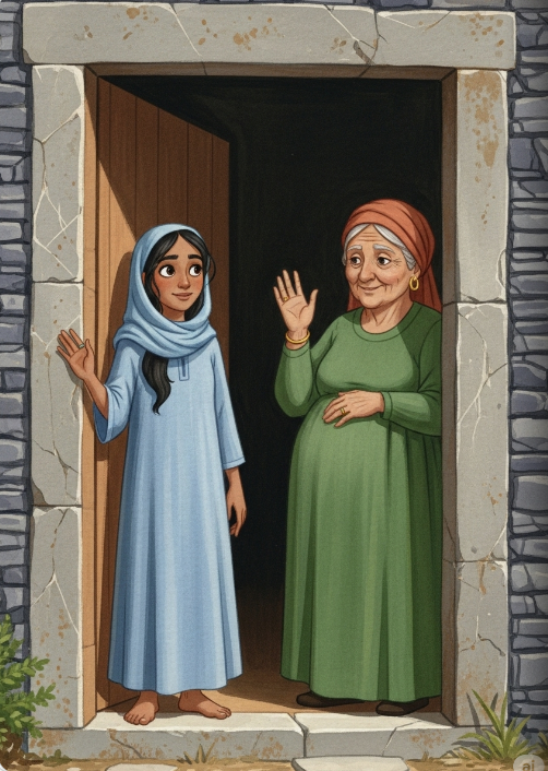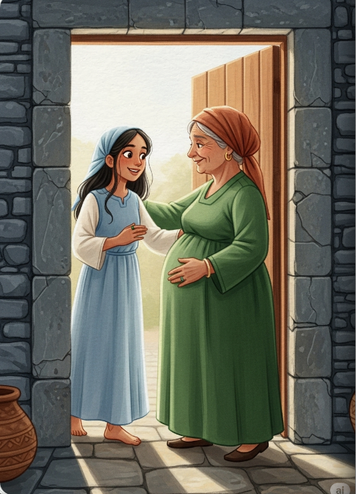 மரியாள் எலிசபெத்தின்வீட்டை அடைந்ததும் அளவற்ற மகிழ்ச்சியடைந்தாள். வீட்டுக்குள் பிரவேசித்து எலிசபெத்தை வாழ்த்தினாள். எலிசபெத்து மரியாளுடைய வாழ்த்துதலைக் கேட்டபொழுது, அவளுடைய வயிற்றிலிருந்த பிள்ளை துள்ளிற்று. எலிசபெத்து பரிசுத்த ஆவியினால் நிரப்பப்பட்டு, உரத்த சத்தமாய்: ஸ்திரிகளுக்குள் நீ ஆசீர்வதிக்கப்பட்டவள். உன் கர்ப்பத்தின் கனியும் ஆசீர்வதிக்கப்பட்டது. என் ஆண்டவருடைய தாயார் என்னிடத்தில் வந்தது எனக்கு எதினால் கிடைத்தது. இதோ, நீ வாழ்த்தின சத்தம் என் காதில் விழுந்தவுடன், என் வயிற்றிலிருக்கிற பிள்ளை களிப்பாய்த் துள்ளிற்று. விசுவாசித்தவளே பாக்கியவதி, கர்த்தராலே அவளுக்குச் சொல்லப்பட்டவைகள் நிறைவேறும் என்றாள்.