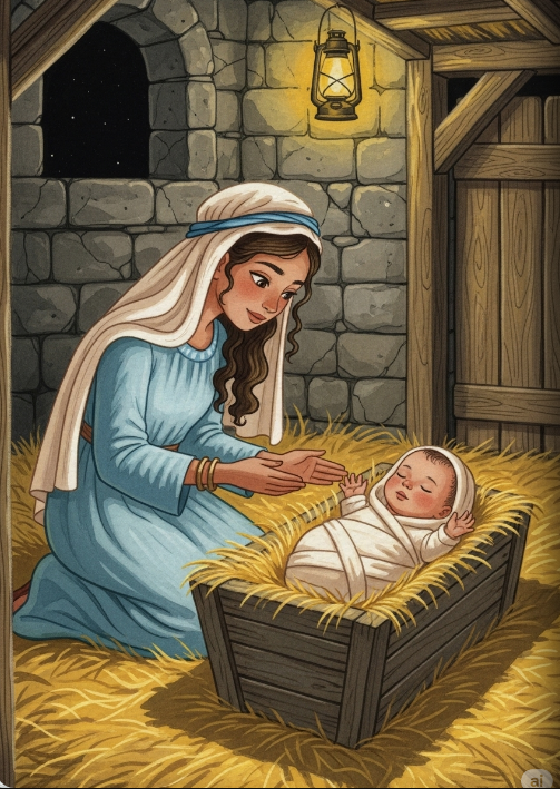 அவ்விடத்தில் அவர்கள் இருக்கையில் அவளுக்குப் பிரசவகாலம் நேரிட்டது. அவள் தன் முதற்பேறான குமாரனைப் பெற்று சத்திரத்திலே அவர்களுக்கு இடமில்லாதிருந்தபடியினால் பிள்ளையைச் சுற்றி முன்னணையில் கிடத்தினாள்.