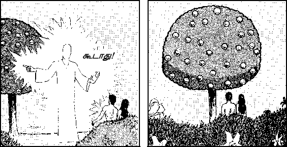 சாத்தான் ஸ்திரியை நோக்கி: நீங்கள் தோட்டத்திலுள்ள சகல விருட்சங்களின் கனியையும் புசிக்கவேண்டாம் என்று தேவன் சொன்னது உண்டோ என்றது. ஸ்திரி சாத்தானைப் பார்;த்து: நாங்கள் தோட்டத்திலுள்ள விருட்சங்களின் கனிகளைப் புசிக்கலாம். ஆனாலும், தோட்டத்தின் நடுவில் இருக்கிற விருட்சத்தின் கனியைக் குறித்து, தேவன்: நீங்கள் சாகாதபடிக்கு அதைப் புசிக்கவும் அதைத் தொடவும் வேண்டாம் என்று சொன்னார்; என்றாள். அப்பொழுது சாத்தான் ஸ்திரியை நோக்கி: நீங்கள் சாகவே சாவதில்லை. நீங்கள் இதைப் புசிக்கும் நாளிலே உங்கள் கண்கள் திறக்கப்படும் என்றும், நீங்கள் நன்மை தீமை அறிந்து தேவர்;களைப்போல் இருப்பீர்;கள் என்றும் தேவன் அறிவார்; என்றது. அப்பொழுது ஸ்திரியானவள், அதின் கனியைப் பறித்து, புசித்து, தன் புருஷனுக்கும் கொடுத்தாள். அவனும் புசித்தான்.