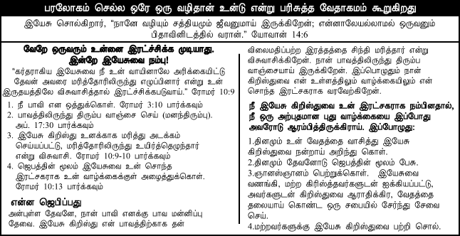 அந்தப்படியே: நீதிமான் ஒருவனாகிலும் இல்லை. உணர்;வுள்ளவன் இல்லை. தேவனைத் தேடுகிறவன் இல்லை. எல்லோரும் வழிதப்பி, ஏகமாய்க் கெட்டுப்போனார்;கள். நன்மைசெய்கிறவன் இல்லை, ஒருவனாகிலும் இல்லை. நாசமும் நிர்;ப்பந்தமும் அவர்;கள் வழிகளிலிருக்கிறது. சமாதான வழியை அவர்;கள் அறியாதிருக்கிறார்;கள். அவர்;கள் கண்களுக்கு முன்பாகத் தெய்வபயமில்லை, என்று எழுதியிருக்கிறதே.